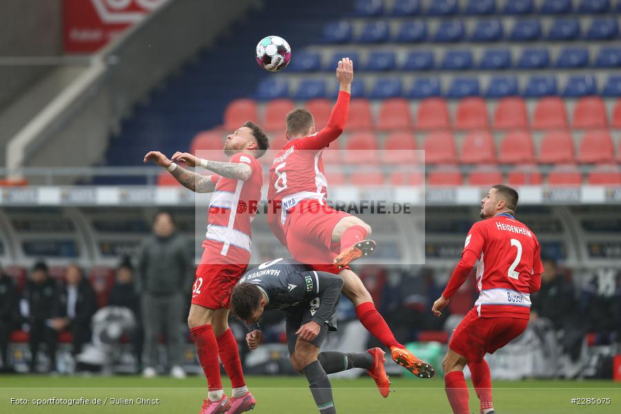 Heidenheim an der Brenz (Deutschland) — Patrick Schmidt (#32, 1. FC Heidenheim) und Patrick Mainka (#6, 1. FC Heidenheim) im Duell mit Hendrik Weydandt (#9, Hannover 96) (DFL/DFB REGULATIONS PROHIBIT ANY USE OF PHOTOGRAPHS AS IMAGE SEQUENCES AND/OR QUASI-VIDEO) [Foto: sportfotografie.de / Julien Christ, - info@sportfotografie.de - www.sportfotografie.de - Die Veröffentlichung ist nur mit Urheberkennzeichnung gegen Honorar gestattet; Belegexemplar erbeten *** Lieferung erfolgt ausschließlich unter Anerkennung der AGB, einzusehen unter https://sportfotografie.de/agb *** Foto nur für redaktionelle Verwendung freigegeben - kein Model-Release / no model release!] (Foto von sportfotografie.de / Julien Christ). Weitere Verwendungsmöglichkeiten auf Anfrage. Bilder die für kommerzielle Zwecke lizenzierbar sind, werden im "Herunterladen"-Dialog auch als solches gekennzeichnet. Bei Fragen zur Lizenzierung und Bildverwendungsmöglichkeiten helfe ich dir gerne weiter. Sende mir Bitte eine Anfrage per E-Mail.