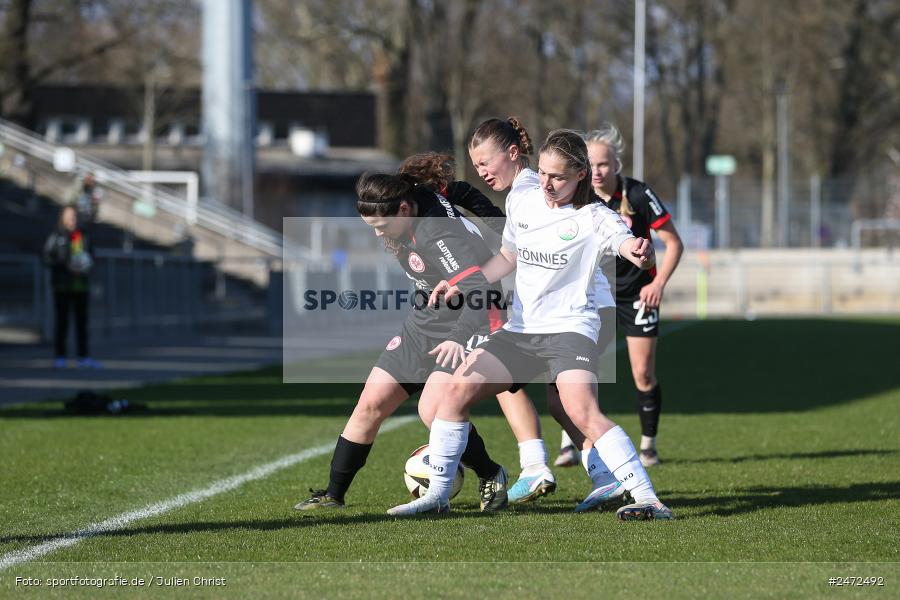Frankfurt am Main (Deutschland) — Lucy Wisniewski (#8, FSV Gütersloh) und Finja Kappmeier (#31, FSV Gütersloh) im Duell mit Georgia Stanti (#10, Eintracht Frankfurt II) [Foto: sportfotografie.de / Julien Christ, - info@sportfotografie.de - www.sportfotografie.de - Die Veröffentlichung ist nur mit Urheberkennzeichnung gegen Honorar gestattet; Belegexemplar erbeten *** Lieferung erfolgt ausschließlich unter Anerkennung der AGB, einzusehen unter https://sportfotografie.de/agb *** Foto nur für redaktionelle Verwendung freigegeben - kein Model-Release / no model release!] (Foto von sportfotografie.de / Julien Christ). Weitere Verwendungsmöglichkeiten auf Anfrage. Bilder die für kommerzielle Zwecke lizenzierbar sind, werden im "Herunterladen"-Dialog auch als solches gekennzeichnet. Bei Fragen zur Lizenzierung und Bildverwendungsmöglichkeiten helfe ich dir gerne weiter. Sende mir Bitte eine Anfrage per E-Mail.