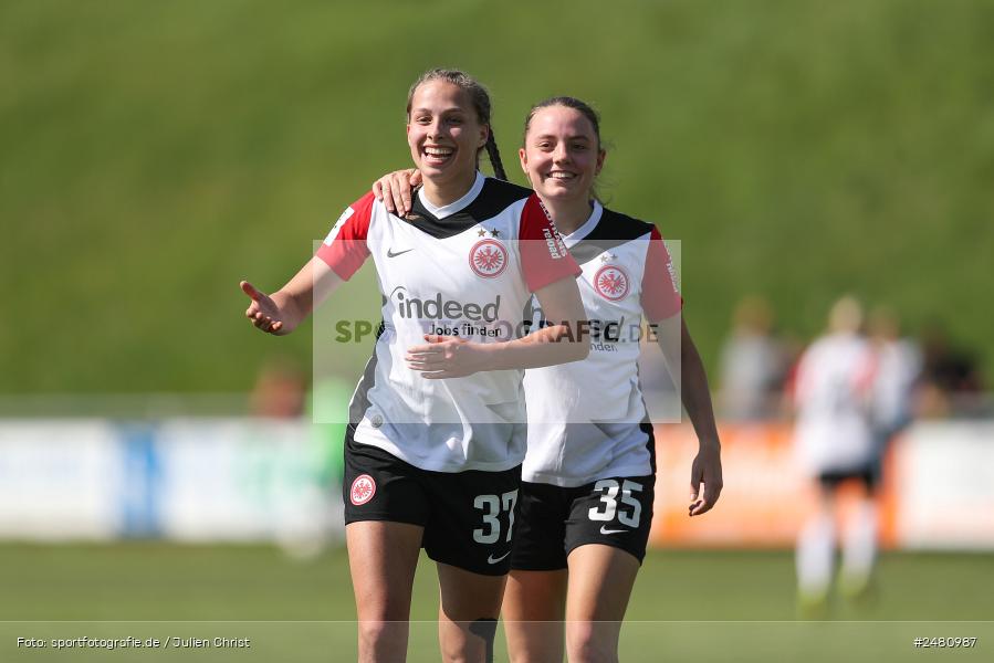 Sachsen bei Ansbach (Deutschland) — Melissa Schmidt-Sommer (#37, Eintracht Frankfurt II), Torjubel nach dem 0:3 mit Helene Schäfer (#35, Eintracht Frankfurt II) [Foto: sportfotografie.de / Julien Christ, - info@sportfotografie.de - www.sportfotografie.de - Die Veröffentlichung ist nur mit Urheberkennzeichnung gegen Honorar gestattet; Belegexemplar erbeten *** Lieferung erfolgt ausschließlich unter Anerkennung der AGB, einzusehen unter https://sportfotografie.de/agb *** Foto nur für redaktionelle Verwendung freigegeben - kein Model-Release / no model release!] (Foto von sportfotografie.de / Julien Christ). Weitere Verwendungsmöglichkeiten auf Anfrage. Bilder die für kommerzielle Zwecke lizenzierbar sind, werden im "Herunterladen"-Dialog auch als solches gekennzeichnet. Bei Fragen zur Lizenzierung und Bildverwendungsmöglichkeiten helfe ich dir gerne weiter. Sende mir Bitte eine Anfrage per E-Mail.